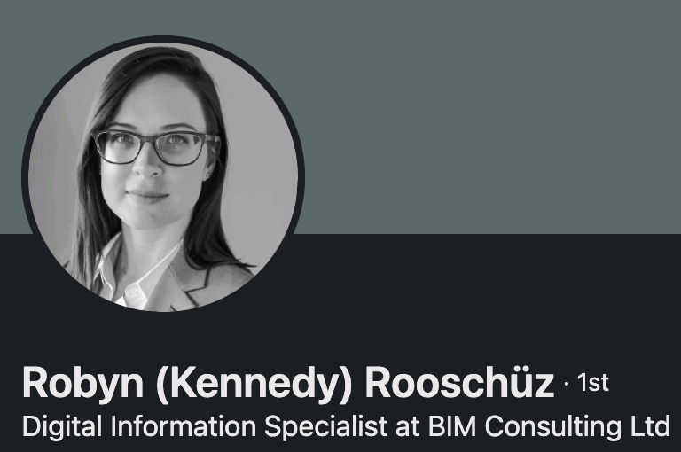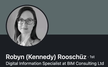 Robyn (Kennedy) Rooschuz -- Digital Information Specialist Robyn is the founder and lead consultant at BIM Consulting Ltd. A BRE-certified Project Information Manager, Task Information Manager, and BIM Auditor, Robyn brings over 7 years of hands-on experience delivering client-side information management across public and private sector projects. Her expertise spans ISO 19650 implementation, CDE strategy, model validation, and data assurance -- with direct experience applying the SFT Standard Information Management Plan on Scottish public sector programmes. Robyn holds an MSc in BIM Management (Distinction), valid SC Clearance, and is an active mentor through Women in BIM Scotland and Assistant Lecturer on the Middlesex University BIM Management MSc.